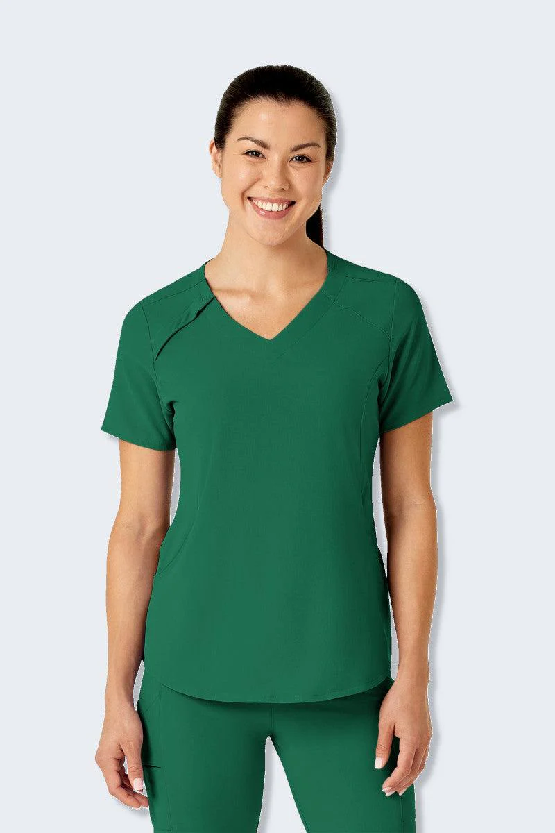 Not only is this top beautifully designed for a trendy, flattering fit, but it also features several built-in enhancements that improve its functionality on the job. These unique features include: