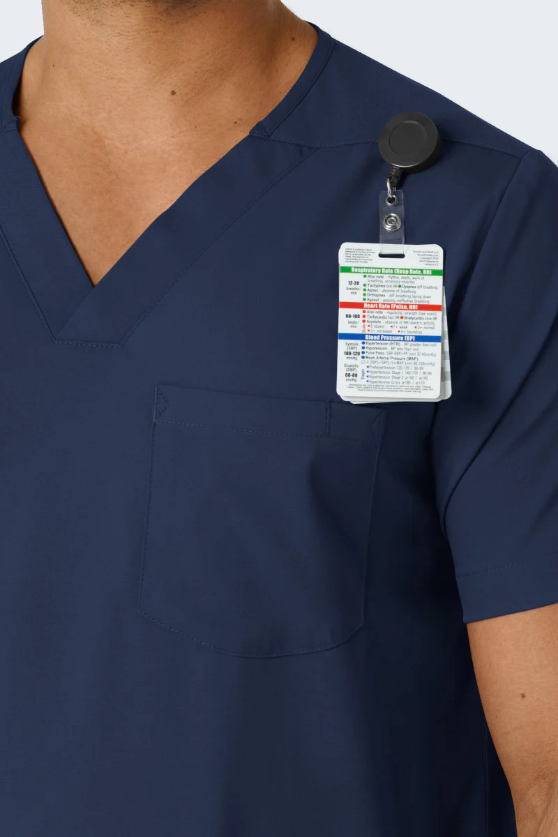Classic style meets modern utility in this men's scrub top. It brings together the best in comfort, style and practicality to deliver the versatility you need to stay on top of your game. The soft and stretchy material keeps your movement feeling free, whether you're taking care of patients at the front desk or making final rounds. Two top-loading pockets keep the tools you need by your side, including a separate slot dedicated to your pen. One back card pocket with a zipper closure takes care of small essentials you like to keep close. Side hem vents open up the silhouette so your scrub top won't bunch up or constrict as you complete what's next on your to-do list. The timeless V-neck construction creates a polished, professional presentation, while the hem drapes slightly longer in the back for a modern fit and fresh style. Built for function, this scrub top aces everyday purpose.