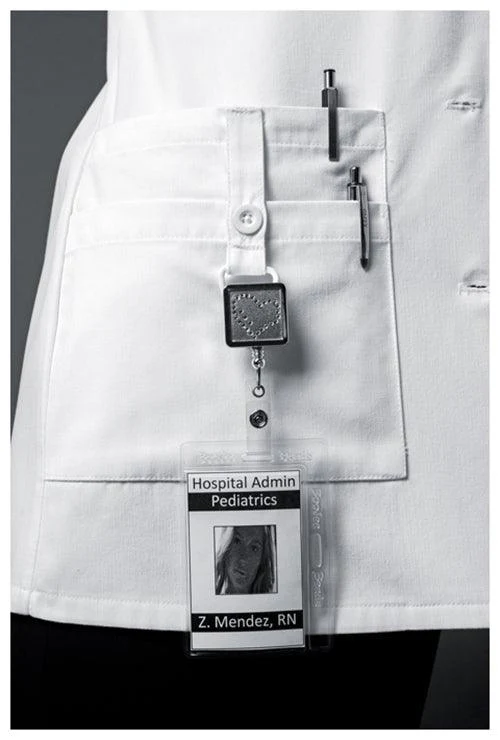 A Contemporary fit button front lab coat features a notched lapel and 3/4 length sleeves with side vents that can be folded up as cuffs. Also featured are four patch pockets (one with a utility strap and D-ring) ring for hanging your ID or accessories. Back darts and centre back belt give this Women's lab coat a flattering shape.