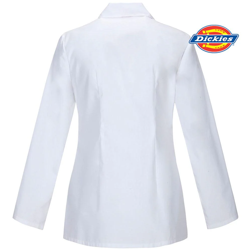 Classic Missy Fit Women's consultation lab coat by Dickies features a notched collar and a three-front button closure. Also featured are one chest pocket and two lower patch pockets. Front and back darts for shaping. A stylish shorter-length consultation jacket that is more like a blazer than a full-length white lab coat. Ideal for Doctors, Students, Dental, Veterinarian, Pharmacy, Beauty or laboratory work.