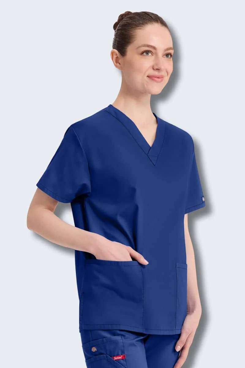 A Modern Classic Fit (allows for women's natural curves), V-neck scrubs top features Dickies logo twill tape at the back neck, patch pockets, a stretchy Red knit interior pocket (White knit pocket on White), and side vents.
