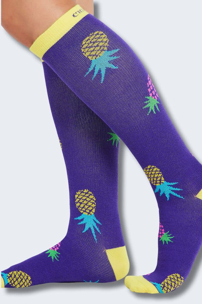 Add some tropical vibes to your routine with Cherokee Pineapple Toss Compression Socks! Featuring fun pineapples on a bold purple background with yellow accents, these socks are as cheerful as they are comfortable. With 10-15mmHg compression, they provide excellent support while adding a splash of island style to your wardrobe. Perfect for keeping legs feeling great and spirits high!