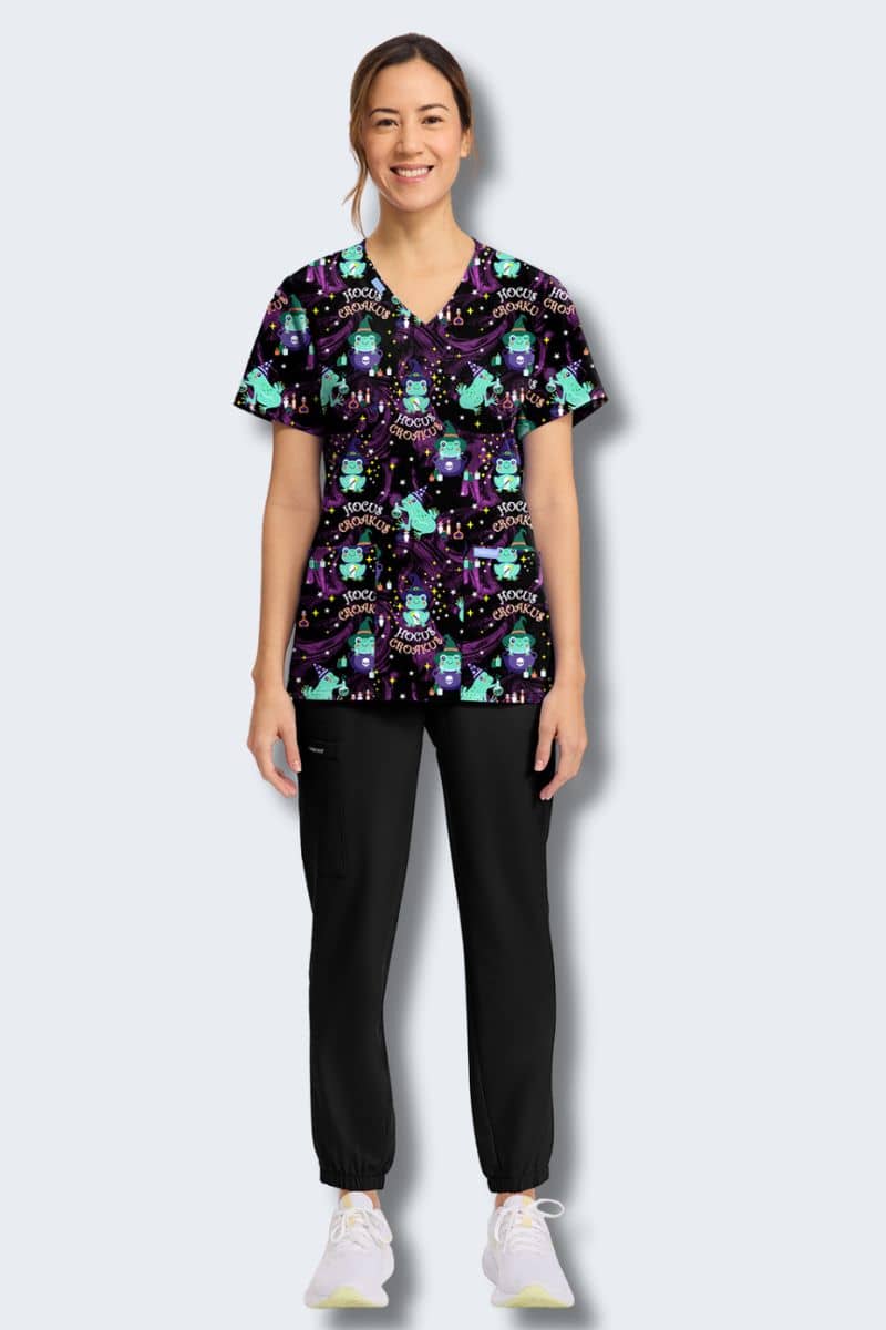 Smart, spirited and made to move, the Hocus Croakus women's print scrub top lets you work your magic in style. Two patch pockets stash all the potions (or pens) you need, while side vents and soft stretch poplin keep every shift feel-good.