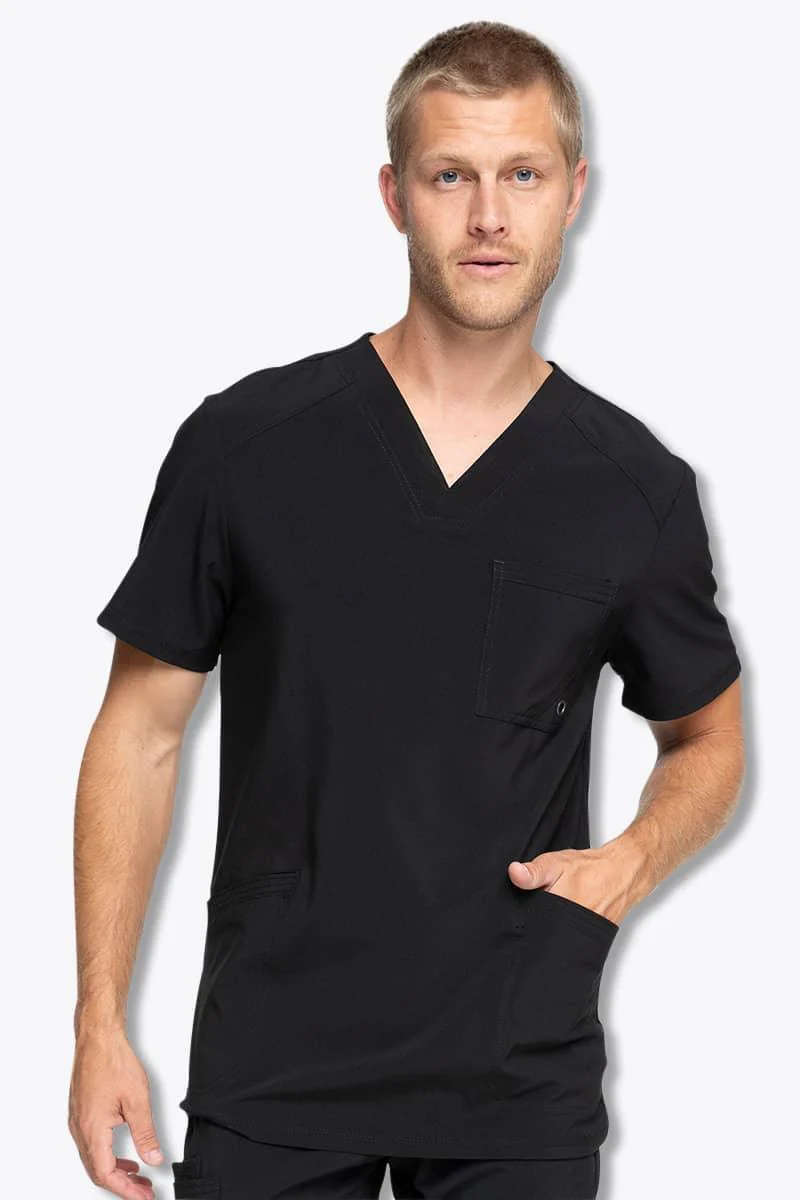 A Men's Athletic fit V-neck top features a chest pocket with grommet detail, front welt pockets with triple-needle topstitching, front and back yokes, and stretch rib knit back panels for extra comfort. The comfortable stretch poplin fabric and super stretchy rib knit are the perfect combos for healthcare professionals.