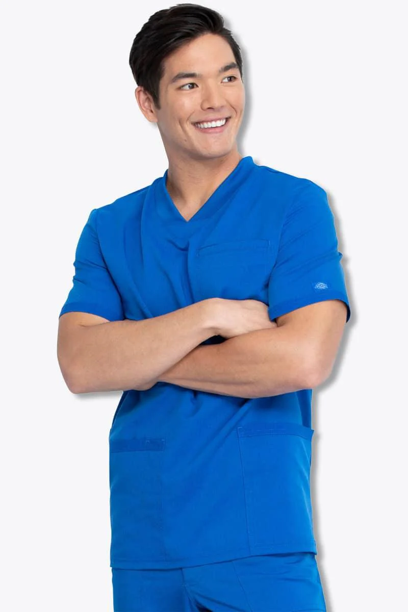 Choose the DK845 Dickies Balance Men's V-Neck Top for intelligent design and versatility. This men's fit top features a flattering V-neck design and is made from a durable blend of 77% polyester, 20% rayon, and 3% spandex for flexibility and easy care. With multiple pockets, including a chest pocket, you'll have plenty of storage for your essentials. It is ideal for healthcare professionals seeking a practical and stylish scrub top. Choose Dickies for reliable and comfortable workwear.