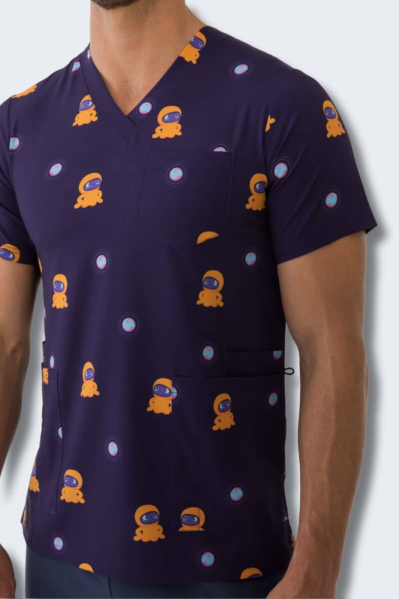 Why healthcare workers love this top: The Blip print features Blip's signature character — an adorable orange space creature — scattered across a deep navy base. It's fun without being loud, making it perfect for paediatric wards, children's clinics, dental practices, and anywhere a smile makes a difference.