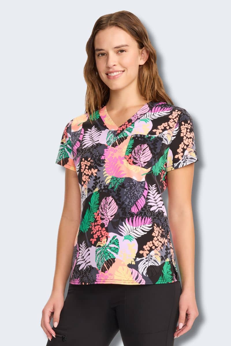 Designed with 4-way stretch Med Couture dobby weave fabric, this scrub top features moisture-wicking, easy-care properties to keep you fresh and professional. The lush jungle print adds a fun, adventurous flair.