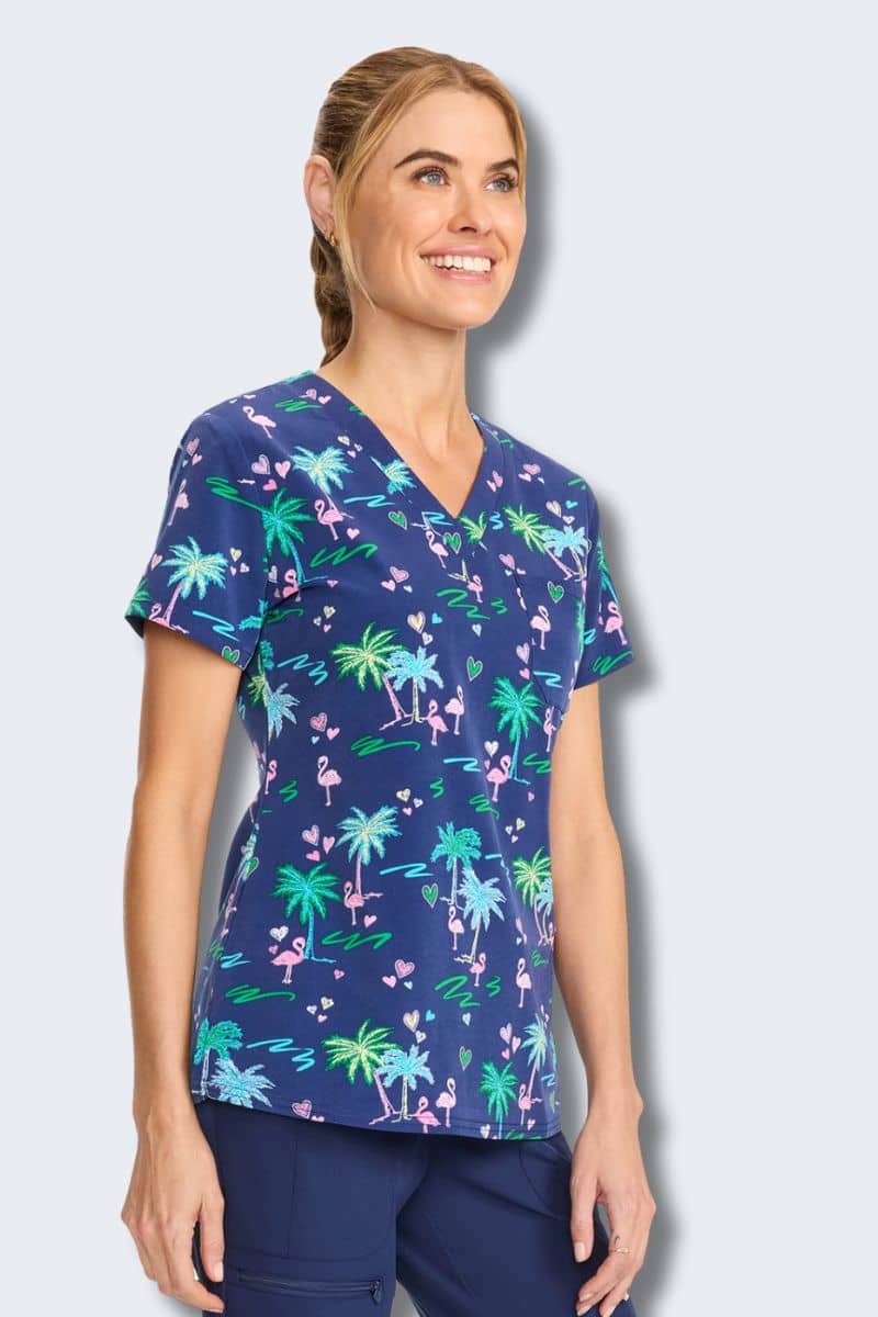 Made with 4-way stretch Med Couture dobby weave fabric, this easy-care, moisture-wicking scrub top lets you move freely while showcasing vibrant tropical prints.
