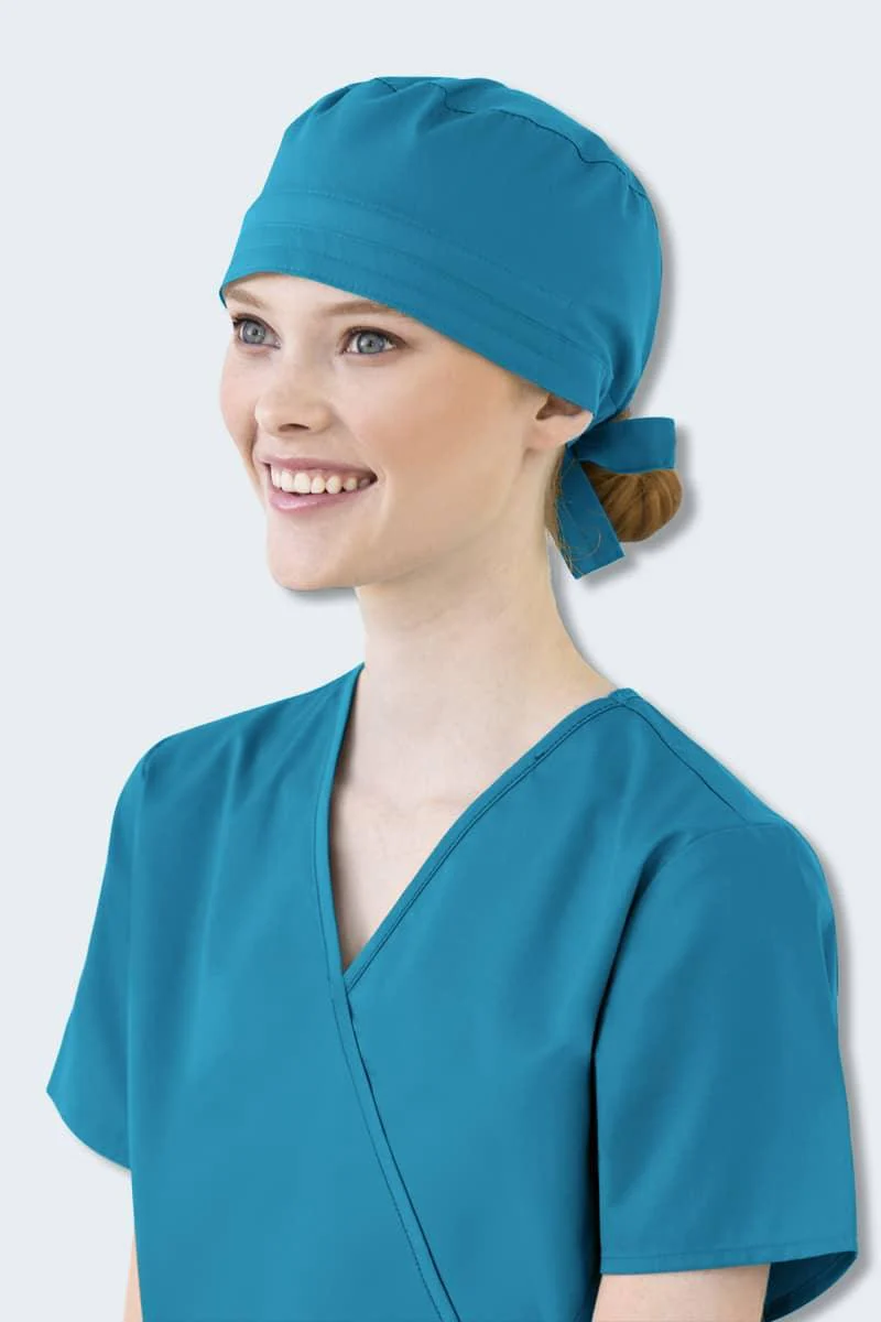 A perfect match for your WonderWink WonderWORK scrubs is this stylish scrub cap. This unisex back-tie cap is ideal for professional men and women in healthcare, and one size fits all. You can make the hat sit right on your head using adjustable ties. This excellent scrub cap features a concealed elastic band and terry cloth sweatband for maximum comfortāthe perfect scrub cap for doctors, nurses and surgeons in the surgical field of medicine.